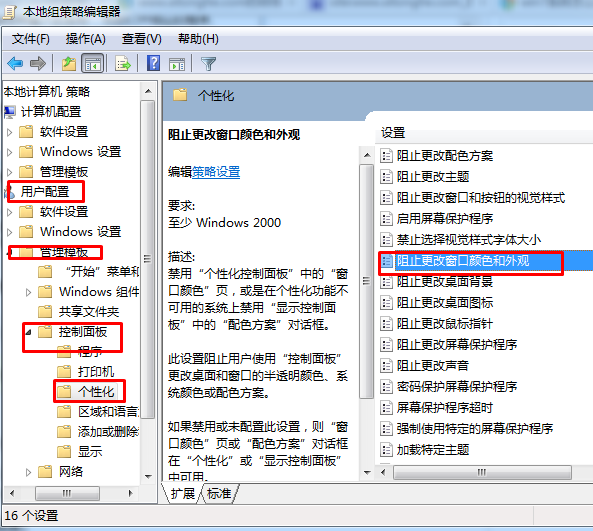 第二步:在系統(tǒng)策略編輯器窗口中,我們在左側(cè)依次展開:“用戶配置”-“管理模板”-“控制面板”-“個性化”,之后,我們在右鍵條目中找到:阻止更改窗口顏色和外觀雙擊打開進行設(shè)置,設(shè)置為“已啟用”這個選項。