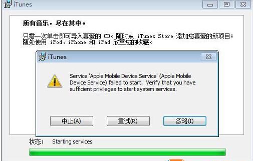 中文含義:服務(wù)Apple Mobile Device啟動(dòng)失敗,并出現(xiàn)中止、重試、忽略等選項(xiàng),當(dāng)然就算忽略了安裝起來(lái)的軟件也不能用。下面小編要分享兩個(gè)解決方法,希望大家能解決 itunes安裝錯(cuò)誤的問(wèn)題。