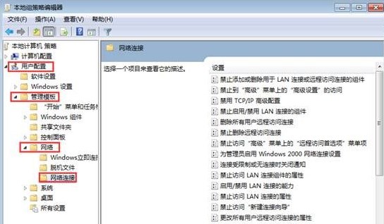 2、來到本地策略組編輯器中,選擇【用戶配置】——》【管理模板】——》【網(wǎng)絡(luò)】——》【網(wǎng)絡(luò)連接】;