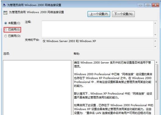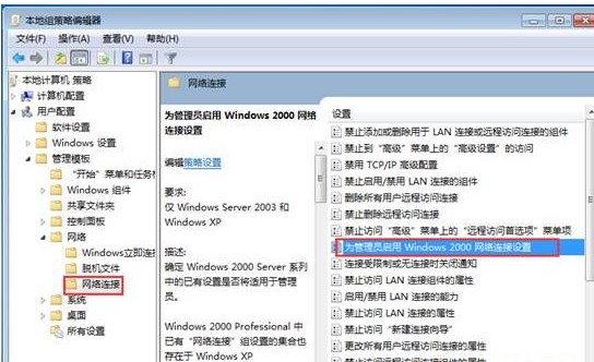 3、選中【網(wǎng)絡(luò)連接】的,在右側(cè)列表中找到“為管理員啟用Windows2000網(wǎng)絡(luò)連接設(shè)置”選項,并雙擊打開屬性;