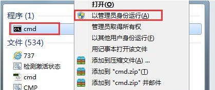 1、點(diǎn)擊開始菜單,然后在搜索框中輸入“CMD”,找到它后右鍵點(diǎn)擊“以管理員身份運(yùn)行”;