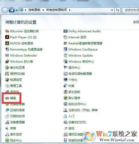 2、把查看方式修改為大圖標或者小圖標,然后找到“鍵盤”并打開,如圖所示;
