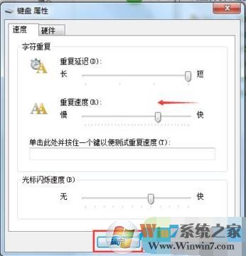 3、彈出“鍵盤屬性”窗口后,把“重復速度”一項,把滑塊往左側拉動一點,調(diào)整到合適的數(shù)值,然后在Win7中長按鍵位來測試看卡住問題是否解決,設置完成后點擊“確定”。