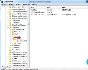 2、在打開的“注冊表編輯器”窗口,依次展開HKEY_CLASSES_ROOT\Directory\shell子健,將shell欄目下的find子項刪除,如圖2所示: