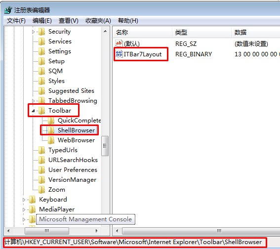4、重新關(guān)閉打開ie瀏覽器看看工具欄是否已經(jīng)回來了,如若沒有,定位到 HKEY_CURRENT_USER\Software\Microsoft\Internet Explorer\Toolbar\ShellBrowser,將這里的二進制值 ITBarLayout 也刪除掉