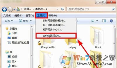 1、點(diǎn)擊上方的“工具”,彈出下拉菜單,再點(diǎn)擊“文件夾選項(xiàng)”,如圖所示: