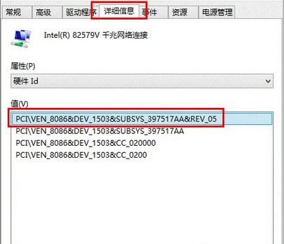 2、找到“詳細(xì)信息”,在屬性選項(xiàng)中選擇“硬件ID”選項(xiàng);