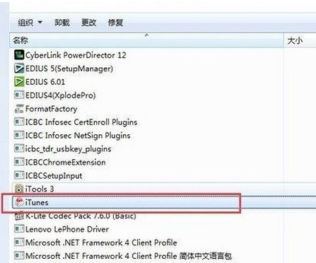 1、打開Win7系統(tǒng)“控制面板”——“程序和功能”,點(diǎn)擊進(jìn)去,我們可以看到有非常多的程序列表,先找到itunes的主體程序。
