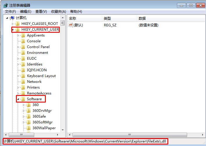 2、然后依次展開(kāi)并定位到HKEY_CURRENT_USER\Software\Microsoft\Windows\CurrentVersion\Explorer\FileExts\.dll;