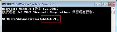 2、進入命令提示符窗口后,輸入“chkdsk /f”命令,按下回車;