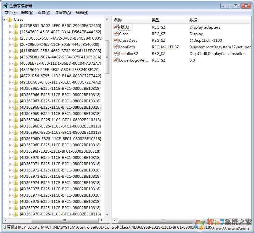 第二步、進入“注冊表編輯器”頁面中,按序打開:“HKEY_LOCAL_MACHINE\SYSTEM\ControlSet001\Control\Class\{4d36e968-e325-11ce-bfc1-08002be10318}項”;