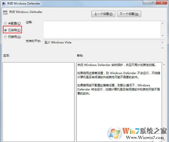 三、在關(guān)閉Windows Defende中,將其配置為已啟用,然后點(diǎn)擊確定。之后重新進(jìn)行Windows Defende的更新即可。