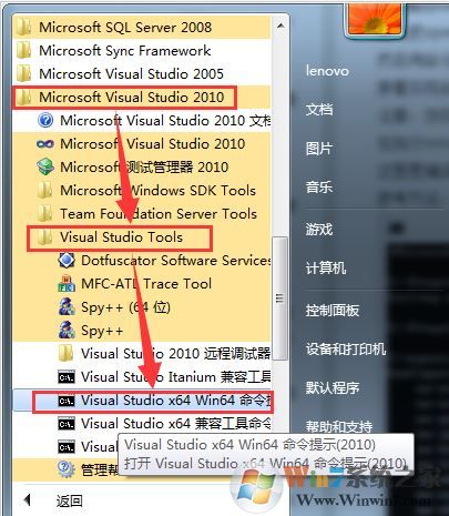 7、打開所有程序,找到在Visual Studio Tools文件夾下的Visual Studio x64 Win64命令提示(2010)工具,如圖: