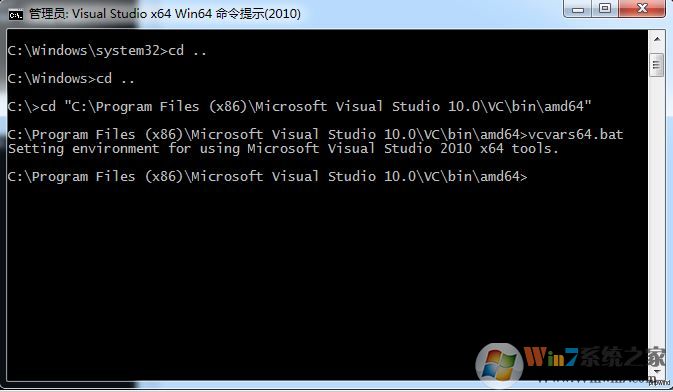 13、將命令提示符定位到C:\Program Files (x86)\Microsoft Visual Studio 10.0\VC\bin\amd64 (VS2010安裝位置), 然后輸入 vcvars64.bat,會顯示Setting environment for using Microsoft Visual Studio 2010 x64 tools. (必須要進(jìn)行操作)