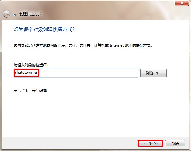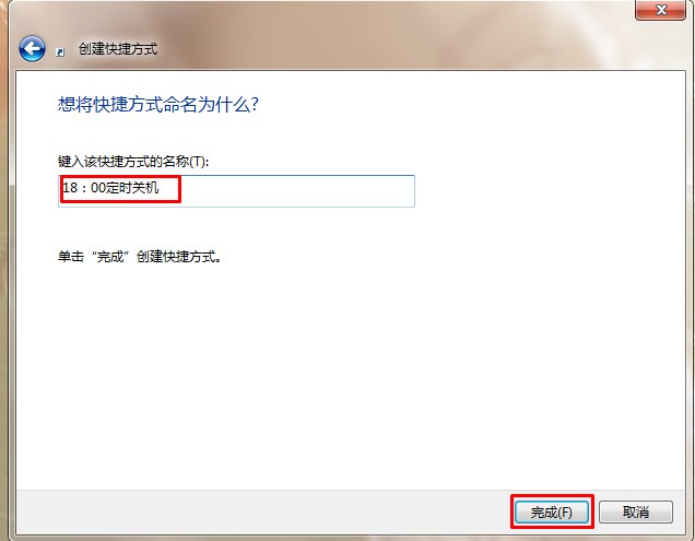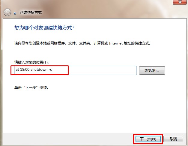 2、點擊【快捷方式】后:輸入【at 18:00 shutdown -s】在對像位置。