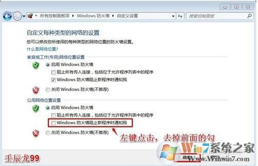 4接下來,在專用網(wǎng)絡(luò)設(shè)置和公用網(wǎng)絡(luò)設(shè)置里,分別左鍵點(diǎn)擊:Windows防火墻阻止新程序時(shí)通知我,去掉前面的勾,再點(diǎn)擊:確定;