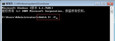 2、輸入“chkdsk X: /f”命令,“f”是磁盤的盤符,大家改成自己u盤的盤符即可,然后按下回車鍵執(zhí)行;