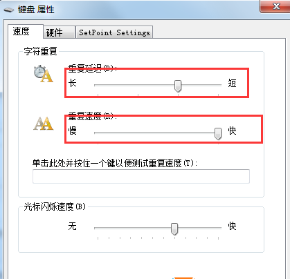 2、打開鍵盤設(shè)置后,在“字符重復(fù)”設(shè)置區(qū)域,對“重復(fù)延遲”進行調(diào)整,一般我們設(shè)置的延遲時間更長些,來緩解上魔窟的狀況,而重復(fù)速度則可以設(shè)置我們按住鍵后重復(fù)字符輸入的速度。怎么樣更合理,還需要用戶自己測試一下。