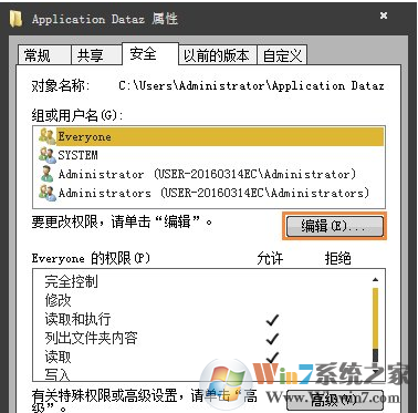 3、進(jìn)入安全選項(xiàng)界面,選擇【everyone】賬號(hào),然后點(diǎn)擊下方【編輯】選項(xiàng);
