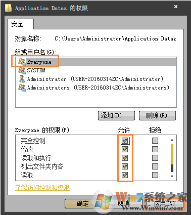 4、進(jìn)入賬號(hào)權(quán)限編輯選項(xiàng),選擇Everyone在下方的權(quán)限中,勾選【允許】,然后點(diǎn)擊【應(yīng)用】,【確定】此時(shí)文件夾已經(jīng)可以打開(kāi)。