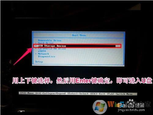 然后,選擇USB Storage Device這一項(xiàng),中文意思是“U盤(pán)存儲(chǔ)盤(pán)”即可從U盤(pán)啟動(dòng)。