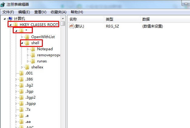 2、依次展開“HKEY_CLASSES_ROOT”——“*”,找到“Shell”