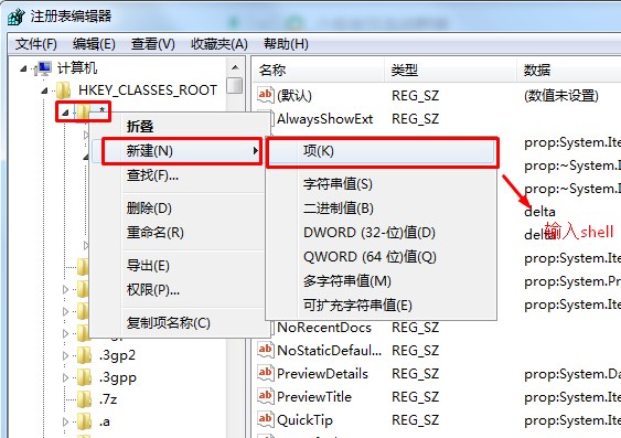 如果沒有該項,我們可以在“*”文件夾上點(diǎn)擊右鍵,然后新建-項-命名為“shell”即可;