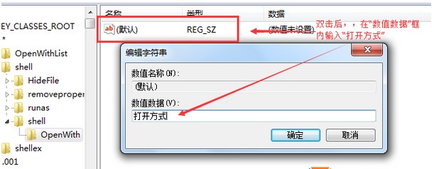 4、我們點(diǎn)擊新建的“OpenWith”項,然后在右側(cè)窗口中雙擊“默認(rèn)”字符串值,在數(shù)值數(shù)據(jù)內(nèi)輸入“ 打開方式”,然后點(diǎn)