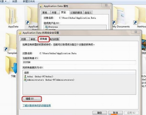 3、在“高級安全設(shè)置”選卡中點(diǎn)擊“所有者”,然后點(diǎn)擊“編輯”;