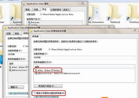 4、然后點(diǎn)擊“將所有者更改為”下方的的“Achai”然后勾選下方的“替換自容器和對象的所有者”,然后點(diǎn)擊應(yīng)用;