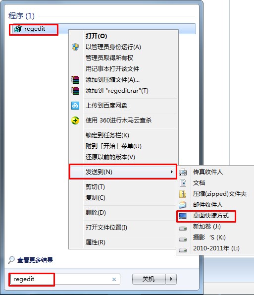 1、在開始菜單搜索欄輸入regedit,找到子文件后右鍵,然后發(fā)送到桌面快捷方式,這樣以后我們可以在桌面點開