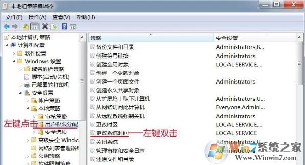 3、在本地策略中找到:用戶權(quán)限分配,左鍵點(diǎn)擊:用戶權(quán)限分配,在用戶權(quán)限分配對(duì)應(yīng)的右側(cè)窗口找到:更改系統(tǒng)時(shí)間,并左鍵雙擊:更改系統(tǒng)時(shí)間。