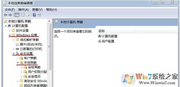 2、在本地組策略編輯器窗口,展開Windows設(shè)置 - 安全設(shè)置 - 本地策略。
