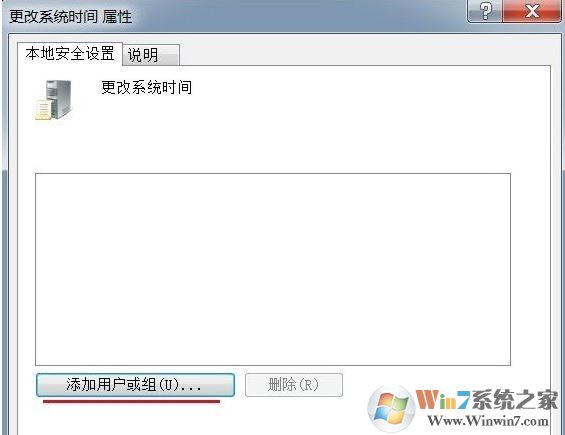 4、在打開的更改系統(tǒng)時(shí)間屬性窗口,我們點(diǎn)擊:添加用戶或組(U)。