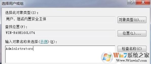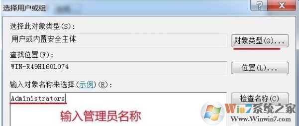 5、在選擇用戶或組窗口的輸入對(duì)象名稱來選擇(U)欄中輸入管理員名稱:Administrators,再點(diǎn)擊:對(duì)象類型(O)。