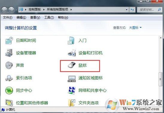 2、進(jìn)入控制面板后,在“查看方式”為大圖標(biāo)或者小圖標(biāo)的情況下,點(diǎn)擊打開“鼠標(biāo)”;