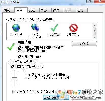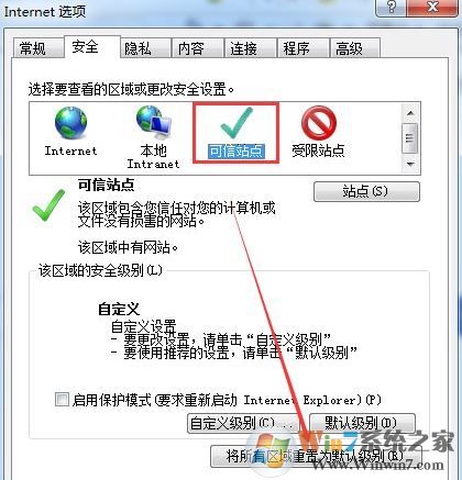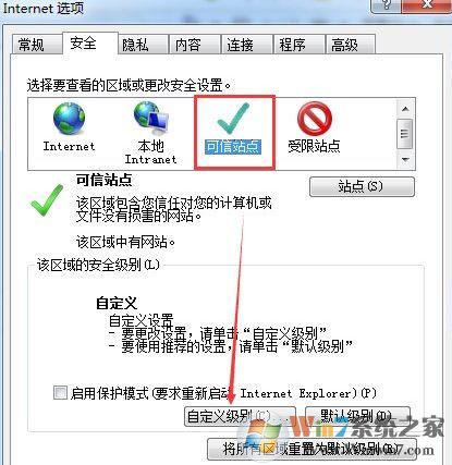 6、也可以選中可信站點后,點擊自定義級別,如下圖所示: