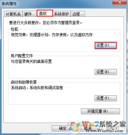 2、進(jìn)入“系統(tǒng)屬性”窗口,在“高級”選項卡下面,點擊“性能”一欄下的“設(shè)置”按鈕;