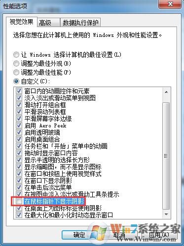 3、、進(jìn)入“性能選項后”窗口后,在下方列表中找到“桌面上為圖標(biāo)標(biāo)簽使用陰影”,取消該項的勾選狀態(tài),點擊確定。