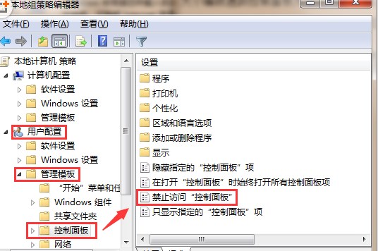 2、在組策略編輯器窗口中,依次展開(kāi)“用戶配置—管理模板—控制面板”;