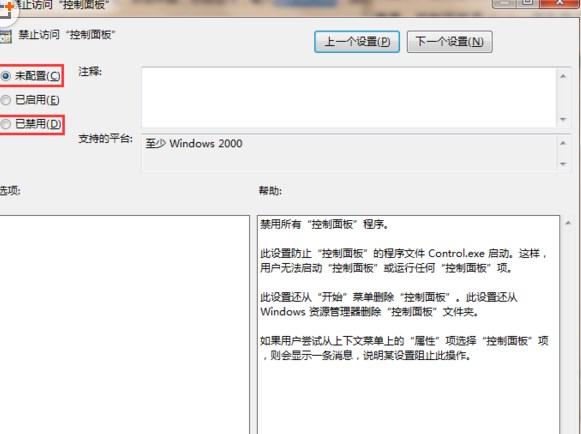 4、點(diǎn)擊編輯后,我們?cè)?ldquo;禁止訪問(wèn)’控制面板‘”窗口內(nèi)點(diǎn)選“未配置”或“已禁用”,點(diǎn)擊應(yīng)用并確定即可。