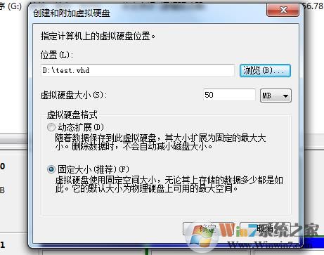 3、然后創(chuàng)建VHD文件的位置,和虛擬磁盤的大??;