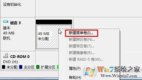 5、對虛擬磁盤“初始化”后,右擊選擇“新建簡單卷”,啟動“新建簡單卷向?qū)?rdquo;,在向?qū)ьI(lǐng)下指定卷大小、分配驅(qū)動器號、格式化等,最后單擊完成按鈕,這樣虛擬磁盤分區(qū)就創(chuàng)建完成了。
