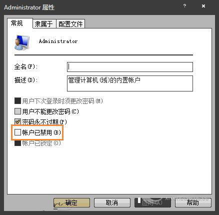 3、在Administrator屬性界面中,取消勾選“帳戶已禁用”,點(diǎn)擊確定即可;