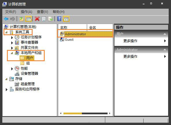 2、展開至計(jì)算機(jī)管理>系統(tǒng)工具>本地用戶和組>用戶,在右側(cè)找到并打開Administrator;