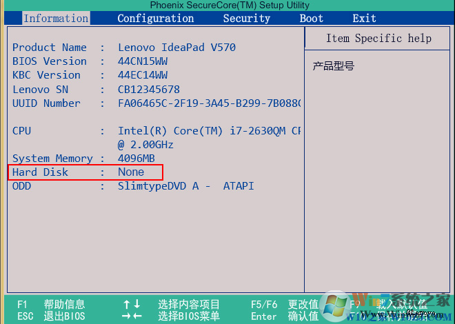1、主機自檢畫面,按鍵盤熱鍵 F2 進入 BIOS Setup(注:部分機型可能使用 F1 或 DEL 鍵),確認主機是否已經(jīng)正確識別到硬盤的型號。如下圖 Hard Disk 處所示: