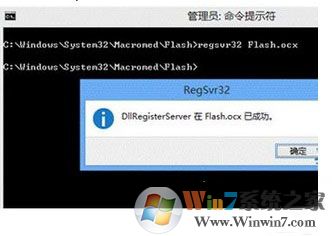 3、打開(kāi)管理員的命令提示符,依次在\Windows\System32\Macromed\Flash目錄下運(yùn)行regsvr32 Flash.ocx和\Windows\SysWOW64\Macromed\Flash目錄下運(yùn)行regsvr32 Flash.ocx,注冊(cè)Flash;