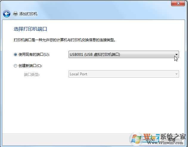 3、接下載選擇打印機的連接端口,打印機連接到電腦的什么接口,有打印機端口,USB接口等,一般USB居多選擇USB虛擬端口即可;