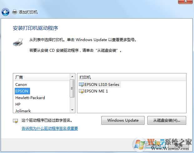 4、然后選擇打印機品牌,并選擇型號,如果之前安裝過打印機,那么這里就會有的,如果沒有的話需要從磁盤安裝,目標指向驅(qū)動程序文件夾。