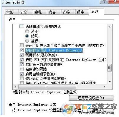 4、切換到“高級”選項中將“禁用腳本調(diào)試(Internet Explorer)”和“禁用腳本調(diào)試(其他)”選項打上勾選,點擊應(yīng)用,如圖所示: